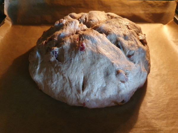 Das Adventsbrot ist etwas behäbig, also gib ihm Zeit. Lass es 1,5-2h an einem warmen Ort gehen, bis der Teig sich mehr als verdoppelt hat. Ich habe den Teig etwa alle 30 Minuten gefaltet, um ihm mehr Spannung und Struktur zu verleihen. Während das Adventsbrot geht, kannst Du den Ofen schon einmal auf 180°C vorheizen.