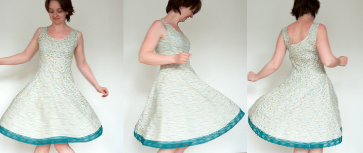 Der Stoff ist eine bedruckte Popeline von Alfatex – eine sehr schöne und gut zu verarbeitende Qualität. Allerdings minimal elastisch, so dass es bei den vielen Nähten besser ist, mit einer weiten Stichlänge zu nähen. Der Rückenausschnitt ist deutlich tiefer als der Halsausschnitt, was mir eigentlich gut gefällt. Aber nach zwei mal tragen, fällt mir nun auf, dass das Kleid im Rücken noch 1-2cm enger sein könnte. Vielleicht korrigiere ich das noch, wenn ich mal viel Zeit und Lust habe.